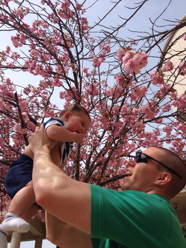 The Cherry blossoms weren’t in bloom for our 10 miler a couple weeks ago, but they are now! (The sun was too bright for me to see the screen; thus, the awkward tree branch that Ben appears to be eating…)