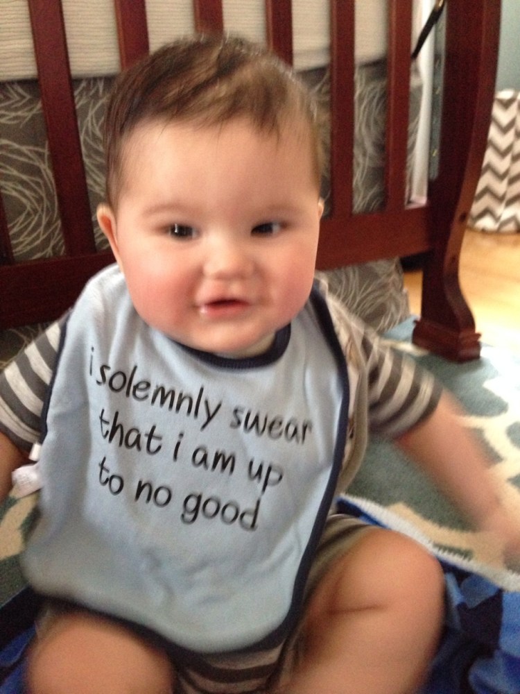 Mischief managed! Thank you for the appropriate bib, Jennifer! Also, it lasted approximately 20 seconds after this picture before it was covered in spit up. Mischievous indeed.