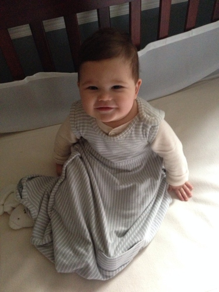 Uh oh. This is how Max greeted me this morning. He’s been sitting for months but this is the first time he has pulled himself into the sitting position. Time to lower the crib!