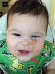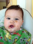 You can sort of see his second tooth in these pics. It’s on the bottom, right next to his first one. Never mind the pear in his eye. Learning to feed oneself is no joke. There will be casualties.