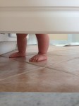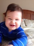 He really enjoys emptying drawers, closing and opening doors, and, as always, stacking. He smiles and laughs a lot, and constantly tries to get us to chase him. When I sit on the floor, he maneuvers around to my back and then peeks around my shoulder, smiling and bobbing his head – this means he would like a piggy back ride. We have a lot of fun together!