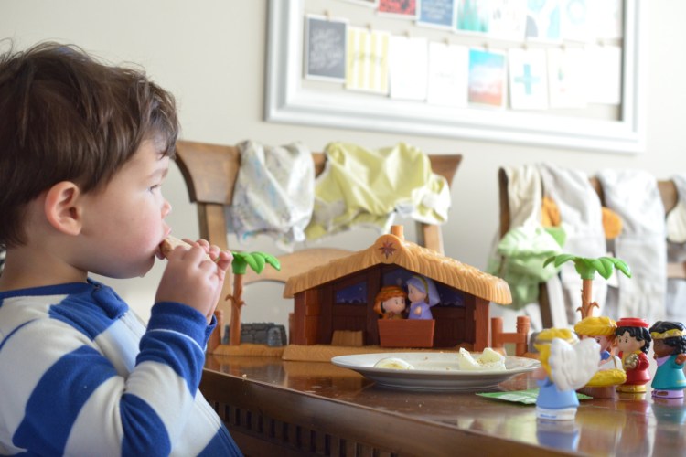 We read the Christmas story from Luke yesterday over breakfast with a little help from the nativity scene Nana gave him last year. Then Mary and Joseph had a moment in the manger box while the angel and wise men gathered around Max’s hardboiled egg. I may need to check my translation.