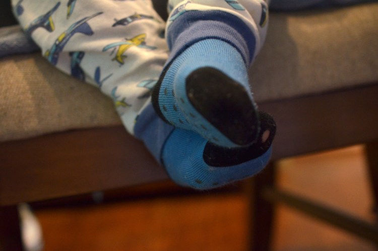Max inspects all his socks for holes. These socks only lasted 5 minutes this morning.
