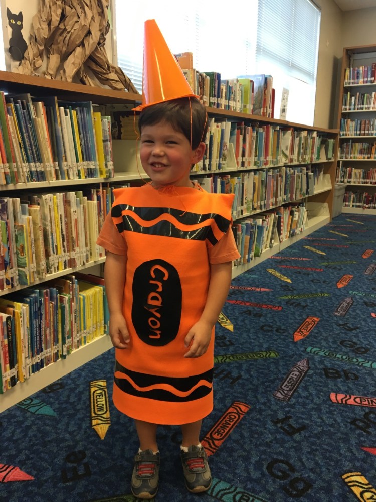 Happy Halloween! He was inspired by The Day the Crayons Quit. He wanted to be the pink crayon, but fortunately for Ben, I couldn’t find pink felt.