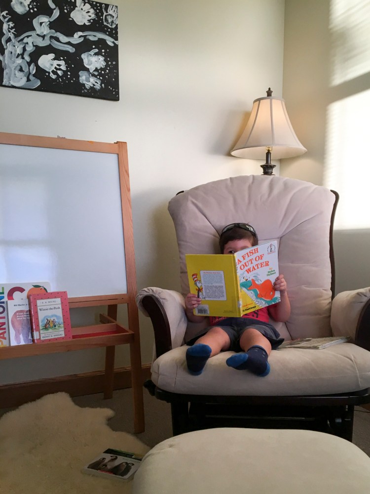 We get plenty of new books from the library every week, and he loves to take them upstairs to his room and “read” when we get home.