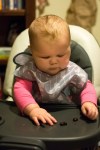 Hazel eats solids now, but only if she can feed herself. She does not like anything on a spoon headed for her face, but loves black beans, peas, bananas, and carrots in finger food form. She also loves rice, which makes a big, sticky, pasty mess when combined with excessive drool. In case you were wondering.
