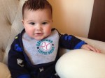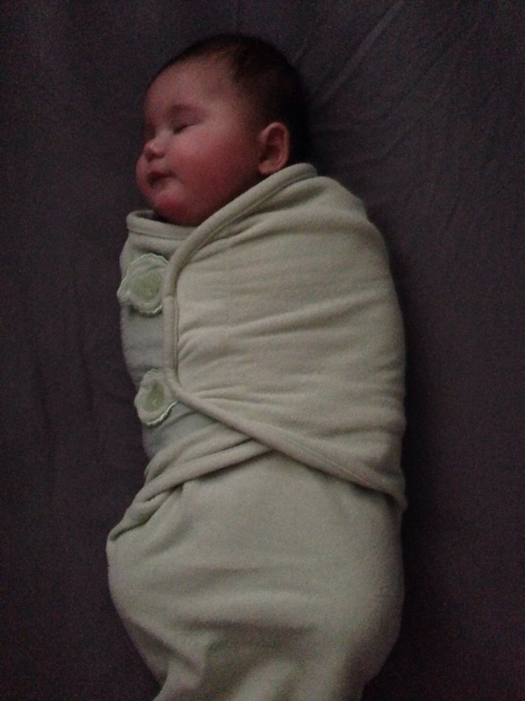 This is how Max sleeps, swaddled. (Thanks for the hand-me-down, Cooper!).We typically wrap him up, pick him up and rock/bounce him for a few minutes until he falls asleep, then set him his crib to nap. His latest trick (can he have TRICKS this young?!) is to refuse to lay his head on my shoulder while I’m holding him (still swaddled), beam at me, then try and plant a big, wet, open-mouth kiss on my cheek. I can’t help but laugh (and wipe myself down), which he thinks is funny, thereby delaying the nap. Clever…