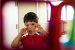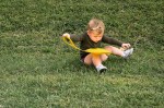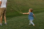 Playing in our backyard. Super-Hazel is hoping Max the dog will come out to play. Max and Nora are jumping over a lake made of yellow rope.
